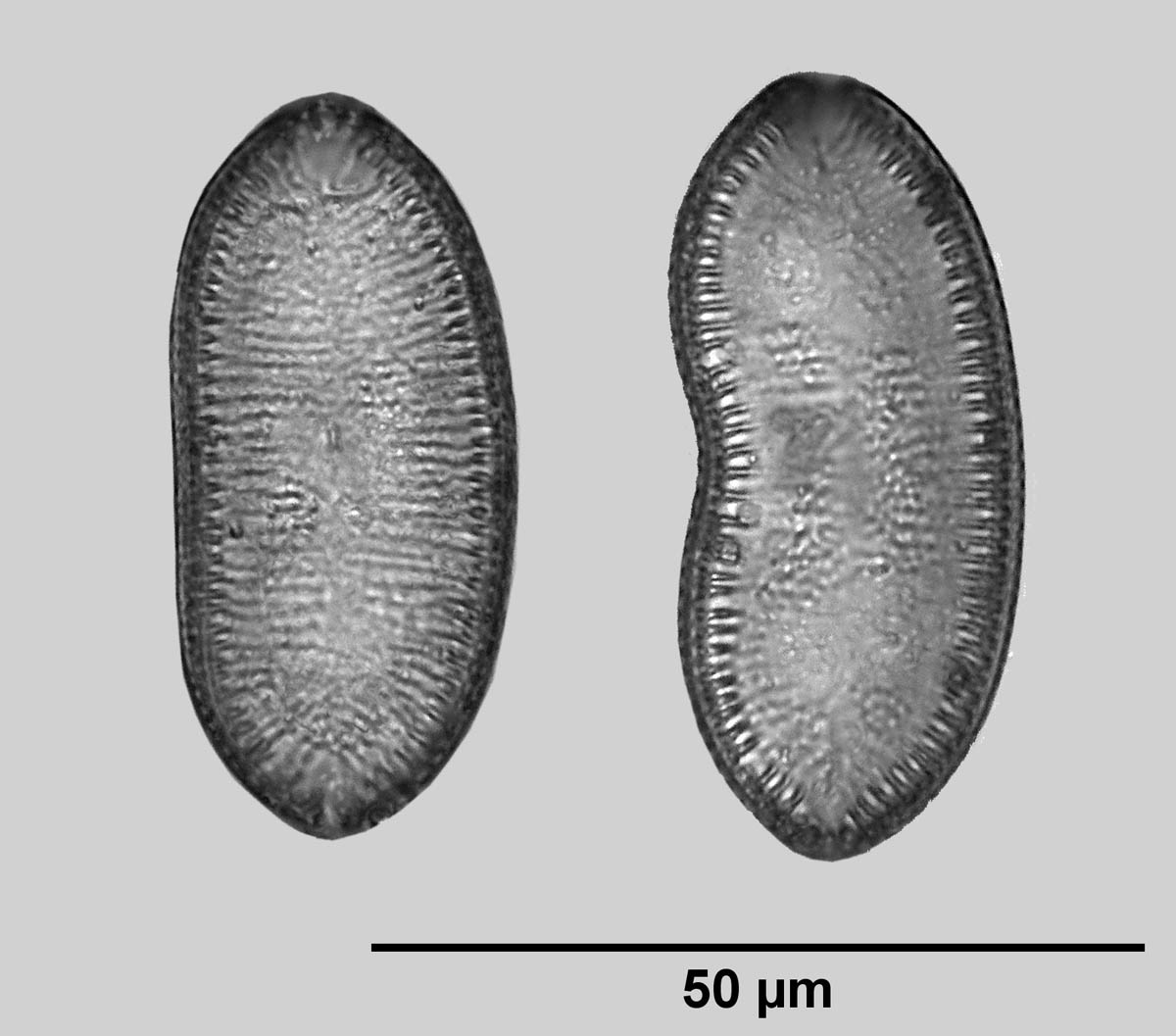 The length of the diatoms was typically in the range of 55 µm to 75 µm. The arched deformed diatoms, however, had a length of only about 45 µm (distance from apex to apex). The following picture gives an impression of the valves of such diatoms: