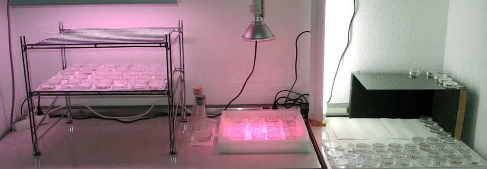 On the left side of the picture at the top you see cultures illuminated by the fluorescent lamp for plants LT - T8 18 W FLEURLIGHT by NARVA. The corresponding emission spectrum can be seen on the left (by courtesy of NARVA Lichtquellen GmbH + Co. KG).