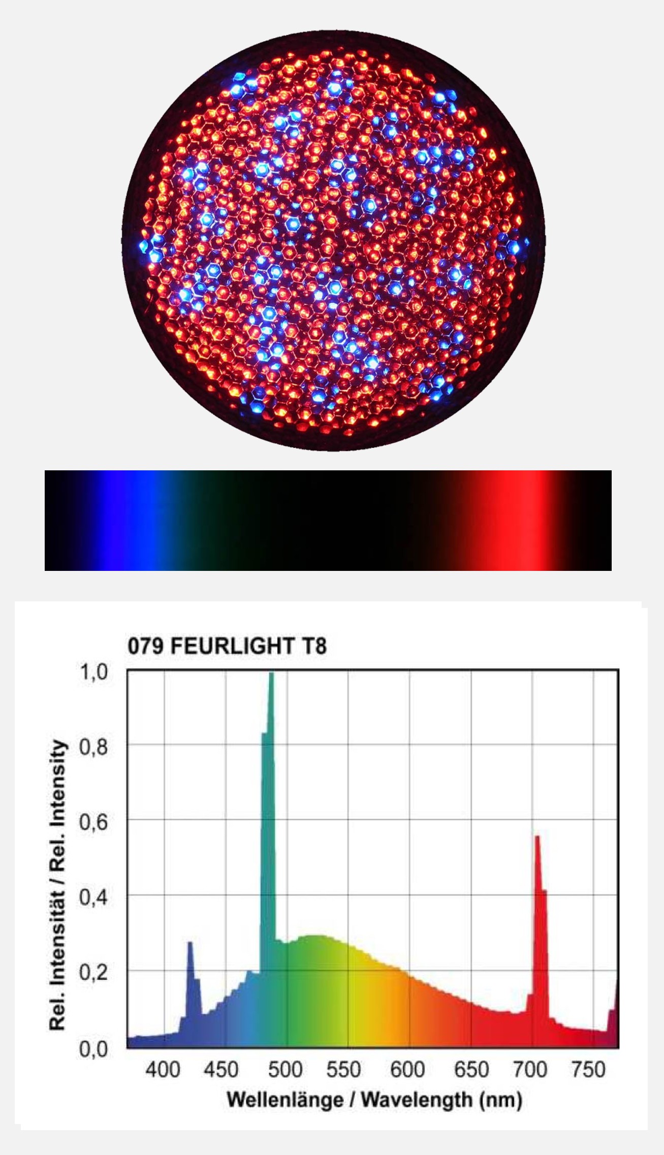 The picture at the top shows in the middle a LED grow lamp (Lunartec FAST GROW PRO Ø 125 mm - blue: 460 - 465 nm, red: 625 - 630 nm), which has blue and red LEDs (See picture on the left) and is mainly offered for land plants, but has proven itself well for diatoms. Apparently the manufacturer specifies a range around the maxima of the red and blue LEDs. Below the lamp the spectrum is shown, which was recorded by us with a spectroscope. The width of the red and blue bands is so large that the red LED can also contribute to photosynthesis of the diatoms.