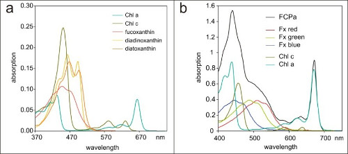 The following illustration shows the absorption spectra of the pigments (1 mM in acetone, a) and a light-harvesting complex (FCPa from Cyclotella meneghiniana, b):