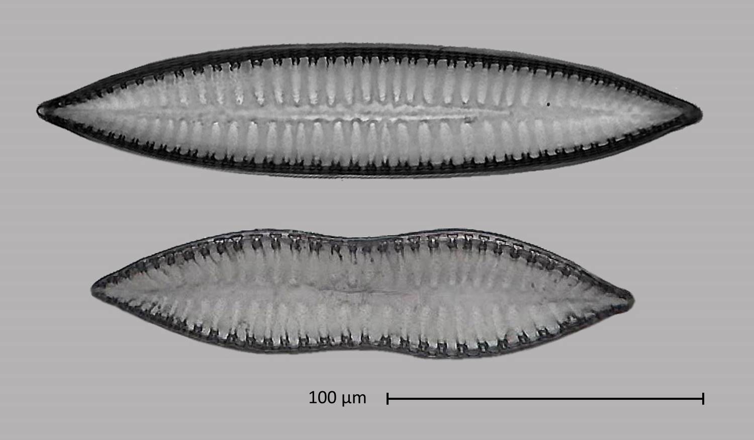The following picture shows an early generation valve with a length of 211 µm. Underneath it is a malformed diatom with a length of 176 µm. All diatoms with concave contours are about this size. The malformation seems to be restricted to the outline.