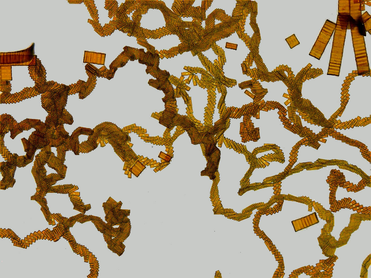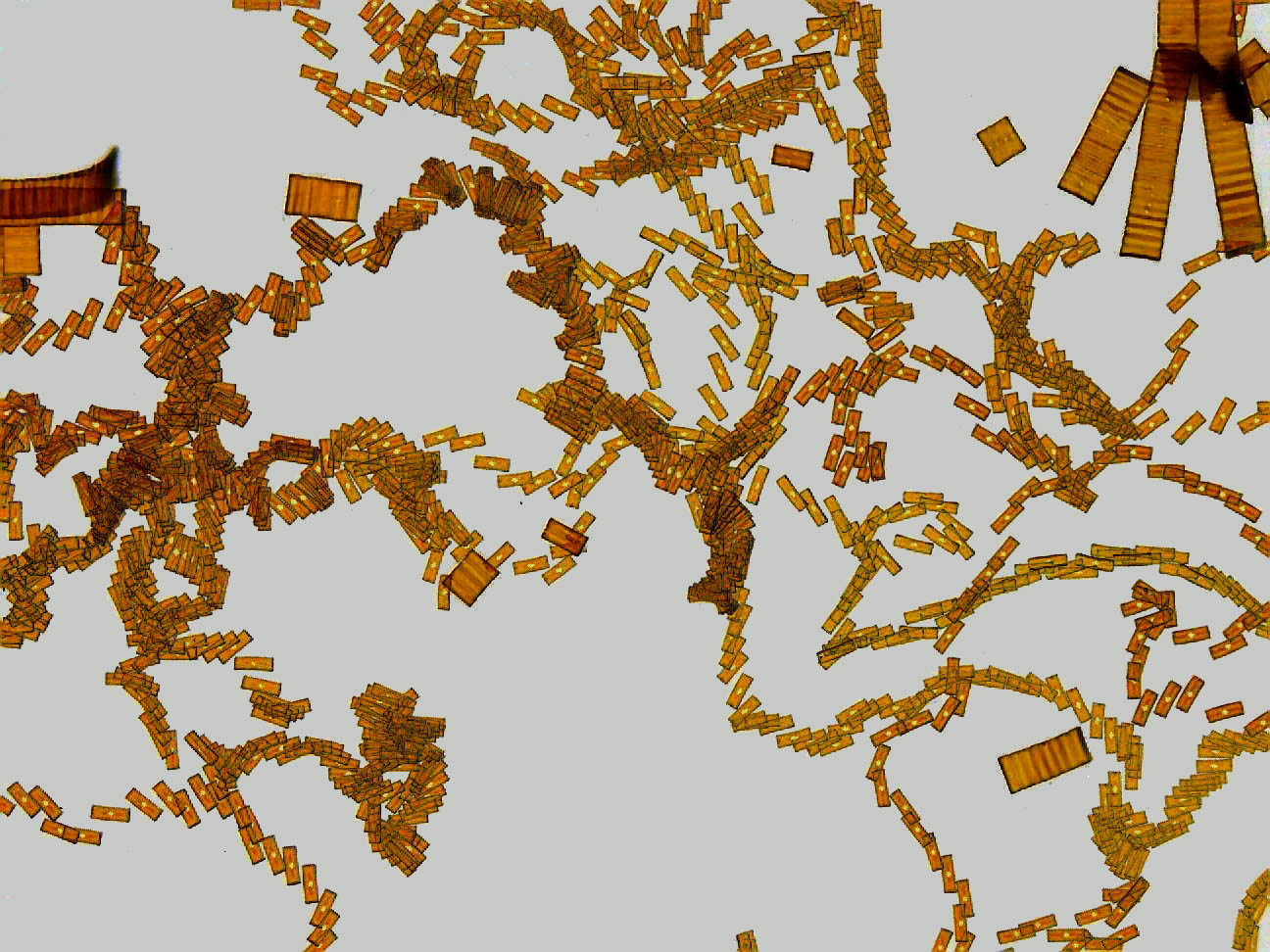 The cultivated Eunotia forms chain-like colonies, which can become very long in vitro. Some pictures can be found on the pages on the size sequence and synchronicityronicity of chain-like colonies. The individual diatoms that have separated from colonies are mobile. Only rarely one observes several connected diatoms in motion. This is why they can probably also be colonised epiphytically. In the first raw culture, besides Eunotia, Cymbella was also present, which colonized Eunotia colonies. The video on the left (4x time lapse) shows the situation.