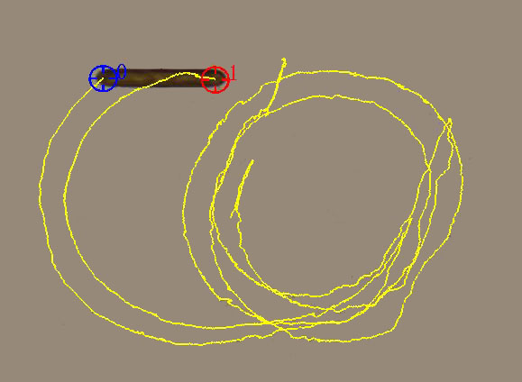 An example of this is an observed species of Pinnularia. One recognizes that the diatom is drawn, the force coming from a region near the leading apex. The trajectories are not everywhere smooth, but an evaluable fluctuation around the direction of movement did not occur (see picture on the left). As Pinnularia has a fairly flat valve, the diatom rests level and a simple mechanical interpretation of P as the center of the driving force is not meaningful. Also the influence of the friction is probably essential. In addition, Pinnularia is often surrounded by a thick layer of mucilage, whose role is not clear with respect to motility. The Raphe has a complicated structure. It is almost closed over a long distance. I assume that for the movement of Pinnularia the tongue-shaped end of the raphe, the so-called helictoglossa, is of particular importance. It could be essential to the position of P near the apex.