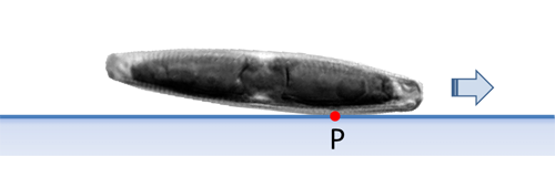 Navicula and many other diatoms have no valve, which has a larger planar surface in the valvar plane. Such diatoms do not lie horizontally on a flat substrate. In case of Navicula there is a vaulted valve between the apices. Therefore, only a short section of the raphe is in contact with the substrate at a time. The point P lies in this contact area and represents the center of force of the drive.
