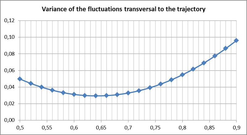 A more suitable alternative criterion for determining P is the magnitude of the fluctuations. As P is the point of rotation of the directional fluctuations, there should be no fluctuations in the case of uniform motion. Due to the fact that the velocity of the diatoms can change rapidly, it is convenient to consider only transverse fluctuations (perpendicular to the trajectory of P). It is therefore possible to use as a criterion that no or only slight transverse fluctuations should occur at the point P. In the following diagram the variance of the transverse fluctuations against the hypothetical values for P is plotted. This was obtained by comparing the observed motion to the smoothed curve (low-pass filtering):