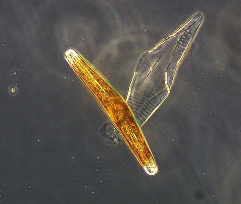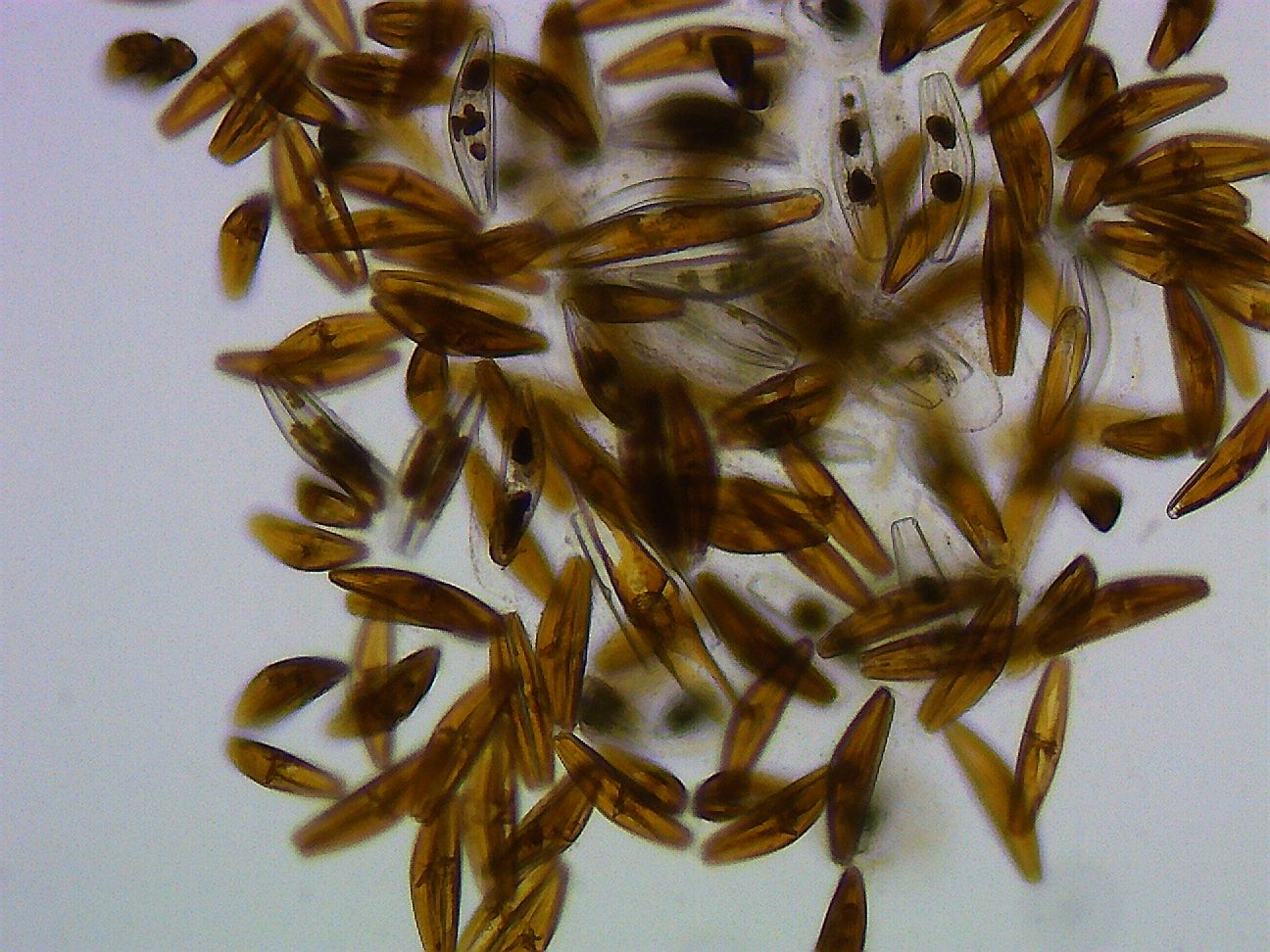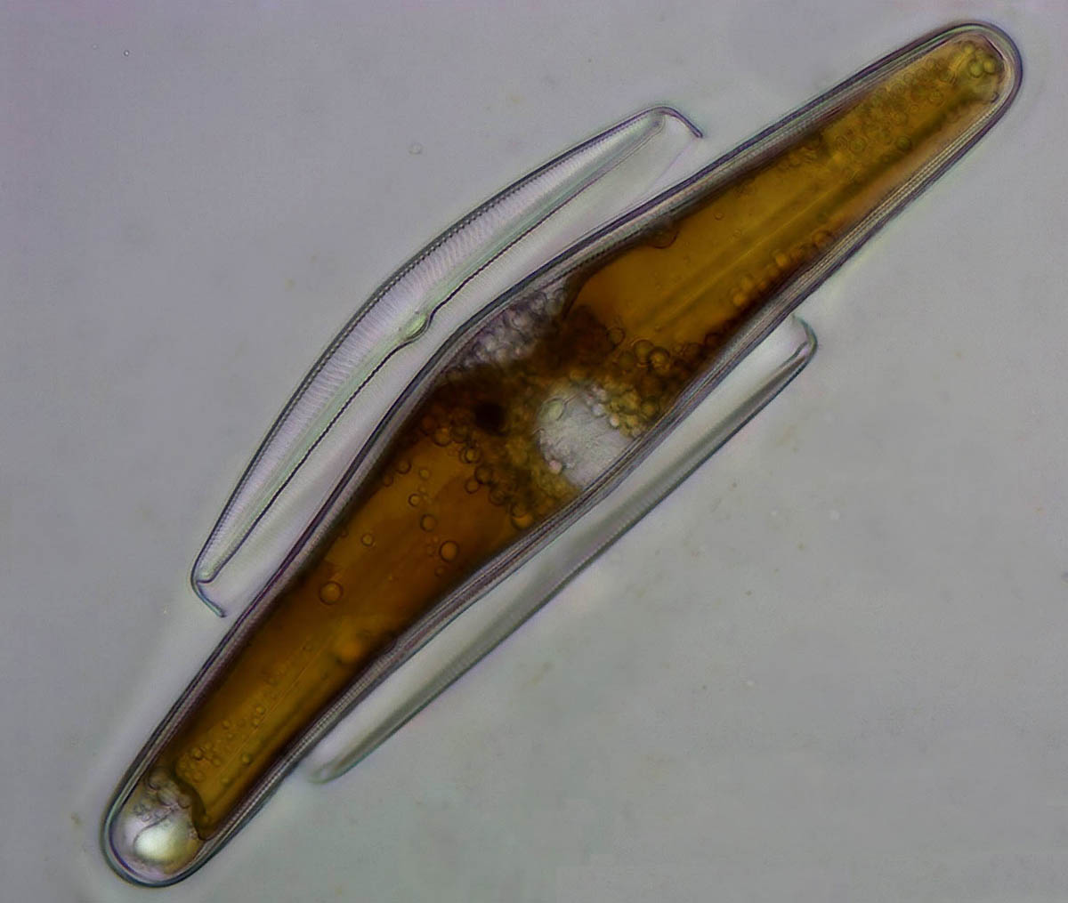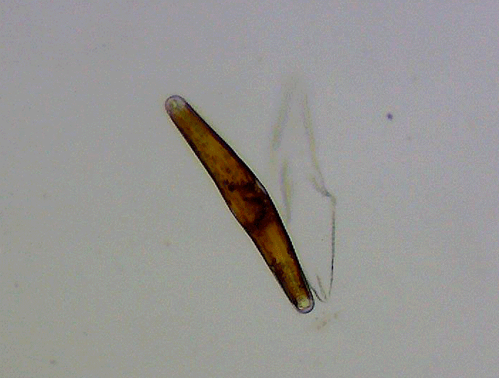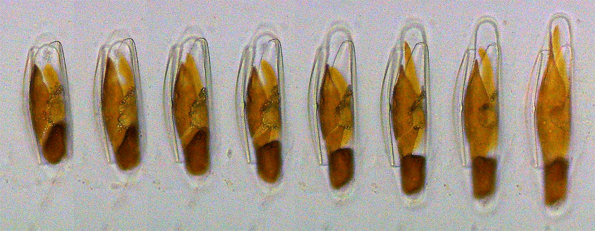 Here you can see in several places evidence of sexual reproduction. A closer look reveals that each auxospore comes from only one cell. In a single diatom, two gametes are formed by meiosis, which then fuse to form a zygote (auxospore). It is a self-fertilization, or more precisely automixis. The valves of the diatoms open and an auxospore grows up. Automixis in Cymbella aspera was described by Lothar Geitler in "Automixis, Geschlechtsbestimmung und Pyknose von Gonenkernen bei Cymbella aspera" (Planta 1956, Vol. 47. pg. 359-373).