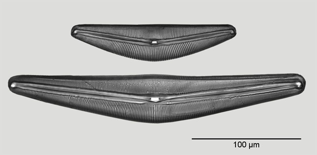 In July 2017 I isolated diatoms of the genus Cymbella found in a pond in Hohenheim (Stuttgart, 48°42'34.0"N 9°12'29.1"E). The size of the diatoms at the time of isolation was about 240 µm and was in the range of 150 to 180 µm after 5 months in culture. The valve with a length of 151 µm can be seen in the upper half of the following image. I assume it is Cymbella aspera.