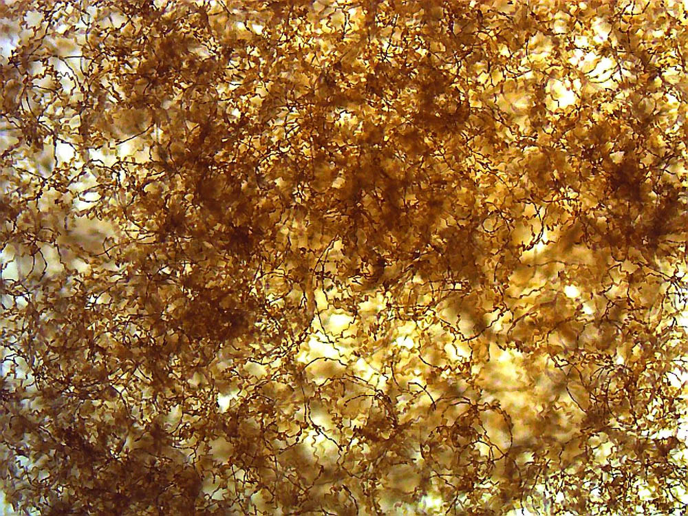 To the right you find pictures of Melosira. First you see a small beaker containing nutrient solution, into which a few fragments of a young Melosira colony have been given. Already after a few days in suitable lighting, a fine web of long colonies appeared. This web was taken with the stereo microscope at two magnifications. In order to achieve sufficient contrast, the photos were taken with dark field illumination. The original colony has already been broken into several fragments.
