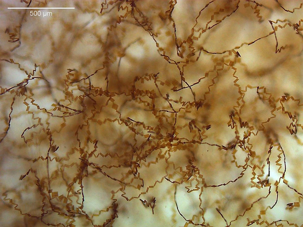 Some diatoms do not separate after an asexual reproduction, but adhere together and form chain-like colonies. These colonies can take the form of filaments, ribbons, stars or fans. The picture above shows a section of a colony of Melosira sp. (click to enlarge). In cultures one can often observe such colonies consisting of thousands of connected diatoms.