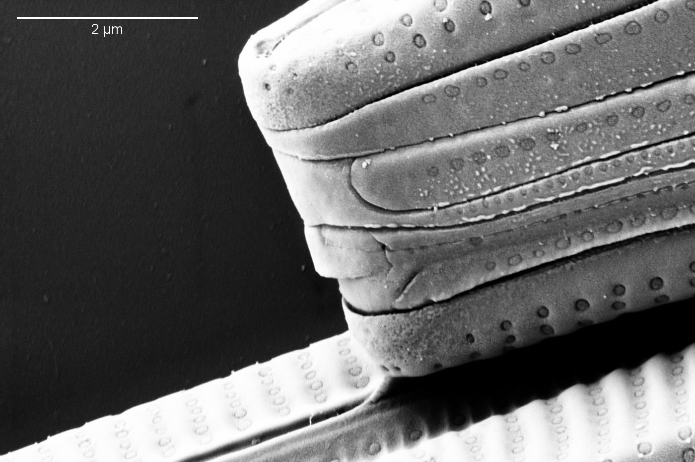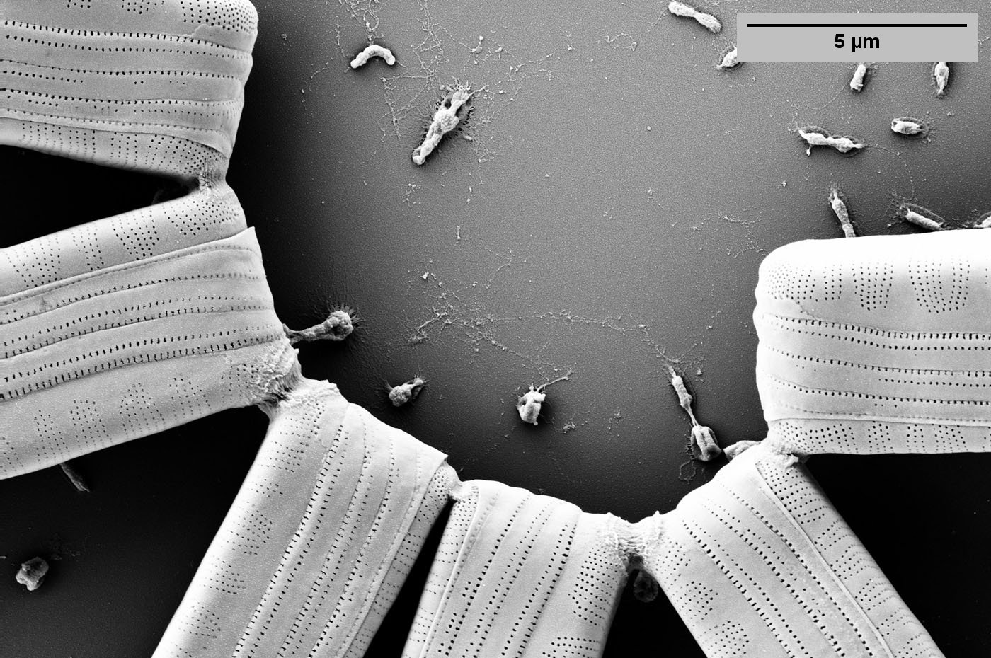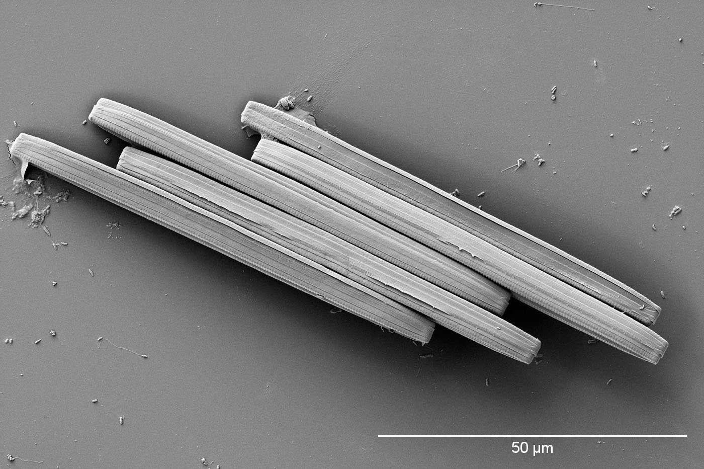 Dr. Nisch has also taken SEM images of Bacillaria paxillifera, which can be seen in an image gallery on the left. One can easily recognize the EPS, which serve the relative displacement. The preparation corresponds to that of the Diatoma species. Since thereby the samples were dried in the air after dehydration, artifacts are to be expected.