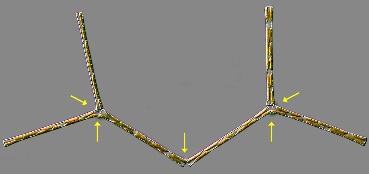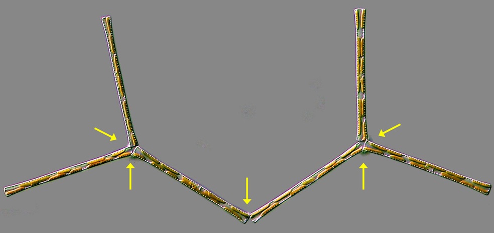 Transitional forms arise between completed concatenated star-like structures. At the top of the page two examples of such forms are shown.In the example on the left, two separations are required for the almost fully developed diatoms to form a colony of two star-shaped structures. In the example on the right, there is just one. In the phase of exponential growth, the proportion of transitional forms is low, which can be explained by sufficient synchronicity of the divisions.