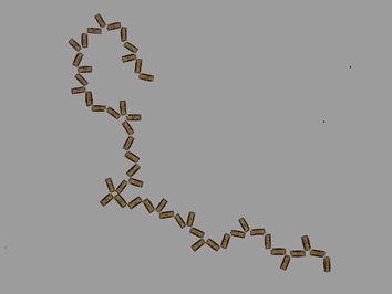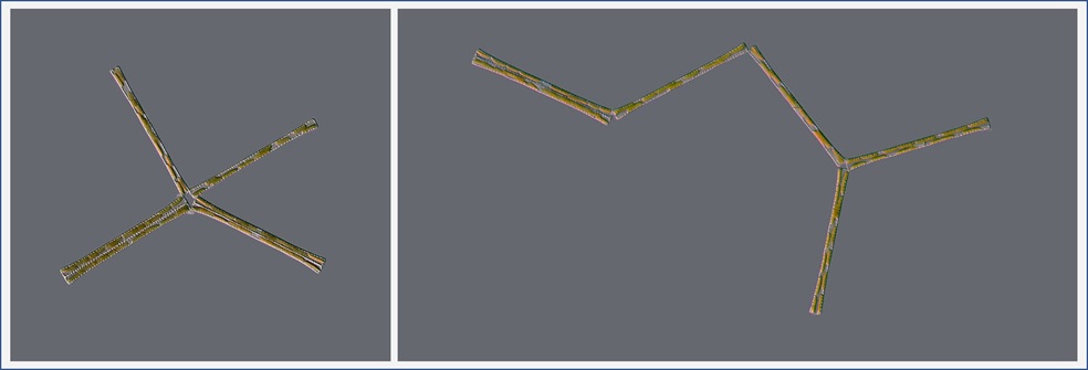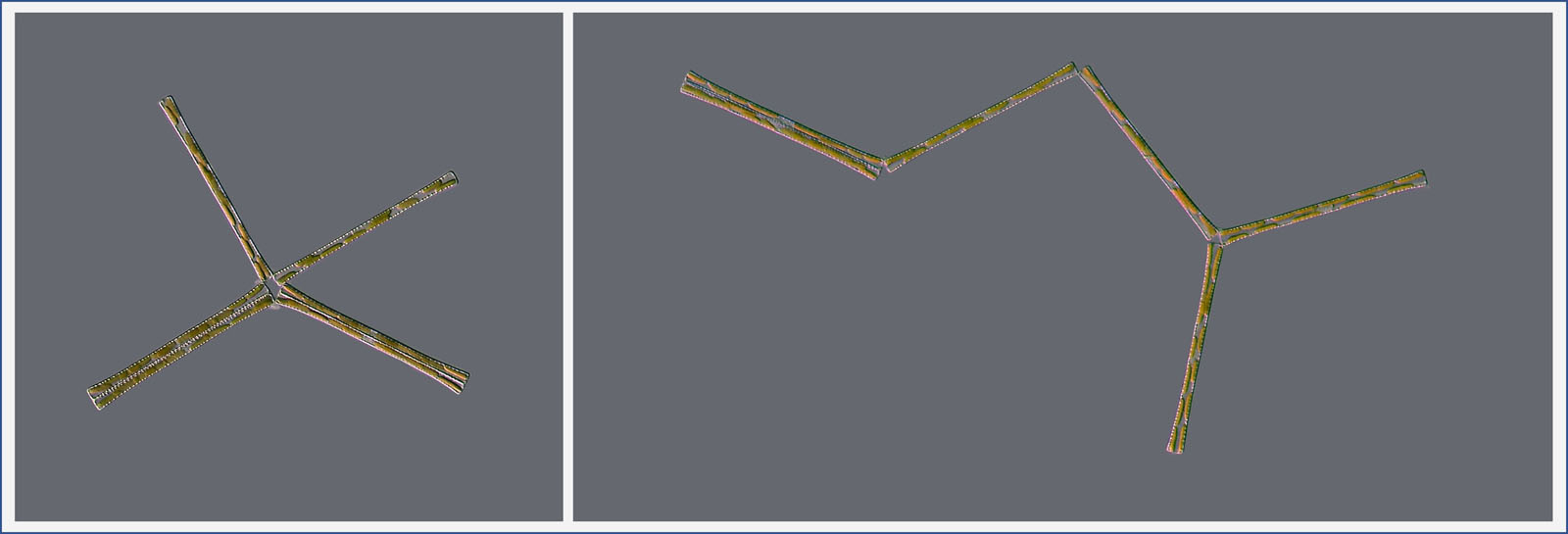 A simple star-shaped colony of three diatoms does not seem to differ from Asterionella formosa with respect to the connection points at first sight, but with two connected stars it becomes clear that the connection points of the diatoms in the chains are not generally located at the same apex (see image below). The two diatoms that connect the two star-shaped structures each have their connections at diagonally opposite locations. The rules of formation must take this into account and allow the typical forms of simple and chained stars to reproduce themselves repeatedly.