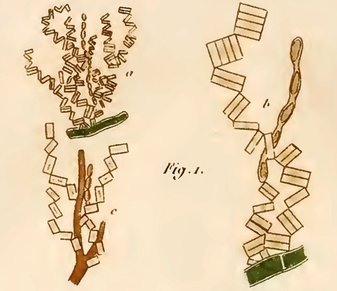 The discoverer of the species, Bory de Saint-Vincent (see his drawing right below) wrote that he could not recognize an order structure in it. Nevertheless, it is possible to find rules for the structure formation, which, however, also have a stochastic part.