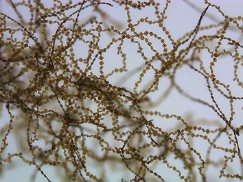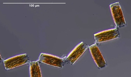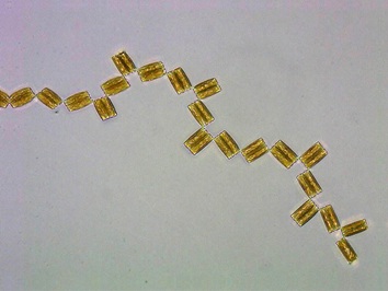 The image gallery of Diatoma vulgaris shown again below left exhibits long zig-zag shaped colonies. The connection points are located at changing positions of the diatoms.