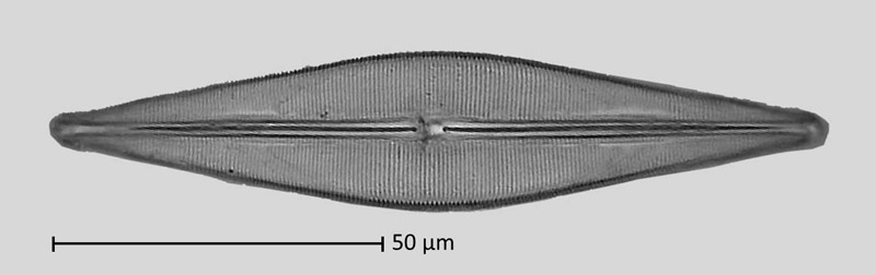More important is the behavior of the diatom at the points of motion reversal. As Craticula cuspidata has two raphes on each valve (see image), one might assume that the driving raphe loses contact with the substrate and the other raphe comes into contact with the substrate by tilting the diatom. In case of the opposite direction of transport of mucilage, the direction of movement would be reversed.