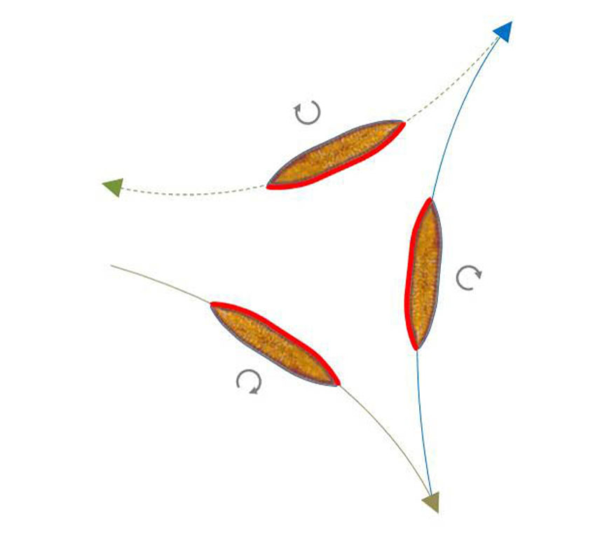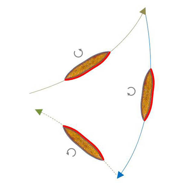 Pleurosigma and Gyrosigma have a raphe-system on each valve, which represents a sigmoid structure with the inflection point in the middle of the valve. A sigmoid path is run through when the centre of force changes from a section with a positive curvature to one with a negative curvature and the direction of travel is maintained. The same applies to the reverse change from negative to positive curvature. Apparently, it is not the position of the raphe-branches that is important but the existence of positive and negative curvatures. A sigmoid raphe-system is therefore not necessarily required. Therefore, the occurrence of sigmoid trajectories can be assumed in Surirella biseriata. A change of the mechanical contact to the substratum from one side to the other is sufficient, as long as the two raphe-branches work in the same direction as the sketch below shows. The trajectory therefore has a inflexion point at the location of the change of contact.