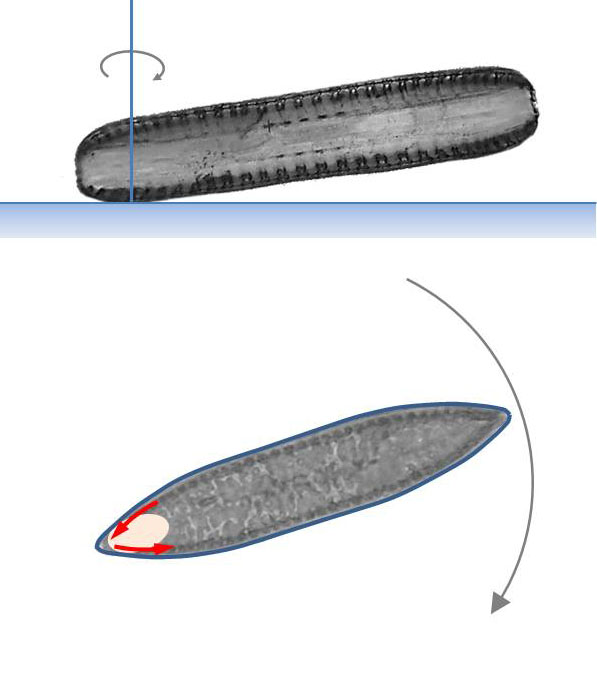 I suspect that rotation occurs when the centre of force is close to the trailing apex and the diatom on both rape branches near the apex comes into contact with the substrate. Due to the convex surface of the valves, the leading apex is more distant from the substrate than the trailing apex (see picture on the left). The apices cannot be focused at the same time in this situation.