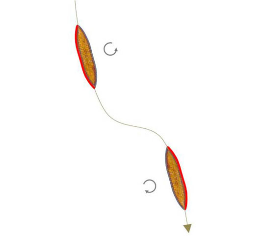 In the sketch below two such reversal points are shown in sequence. The raphe which is active in the sections is marked in red. It is in mechanical contact with the substrate.