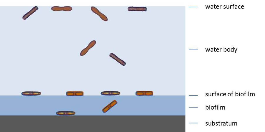 Diatoms in the body of water can in small culture vessels only be observed for a short time after the water has been whirled up. At the small height of the petri dishes, sedimentation occurs rapidly. Occasionally diatoms that have been swirled up remain attached to the water surface for a long time. If diatoms form sufficient thick biofilms, a distinction between diatoms within or on the biofilm can be made.