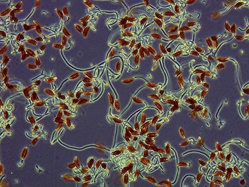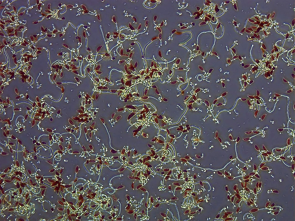 The first time-lapse video recorded with PlasDIC at the top (Video 1) shows a two-week-old culture. You can easily recognize the mucilage stalks, many of which were abandoned by the diatoms. The free diatoms move between the mucilage formations until they settle and generate their own stalk.
