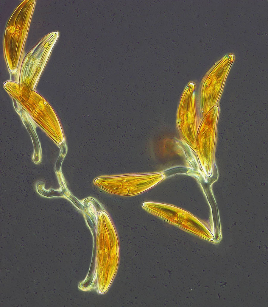 During the formation of a stalk a thick gelatinous substance (EPS) is secreted through apical pores in the valves. If you look at the mucilage stalks with PlasDIC, you will find surface structures that run parallel to the direction of the stalks. The image at the bottom left was created by superimposing several images (focus stacking) and subsequently sharpening the picture (click to enlarge). In the phase contrast this can be recognized in some images, such as the branched small colony shown above.