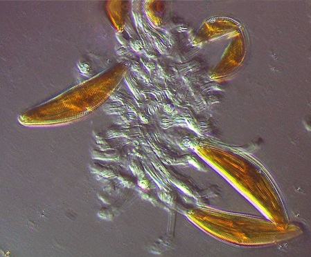 In the post on sexual reproduction, Cymbella cistula was presented that dwell on mucilage stalks. Their lengths ranged from 54 µm to 120 µm. In the observations described below, their length was approximately 110 µm. These diatoms adhere to the substrate, form a stalk and then divide. In nature, these colonies are attached to aquatic plants or stones. This gives them an advantage in streaming waters. They can also be found in ponds and lakes.