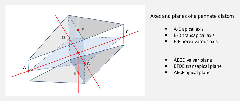 The ends of the diatoms (apices) lie at the points A and C. The valves were deliberately not represented as planes, in order to indicate that there is not necessarily only a single stable position in which the diatoms lie on a valve.
