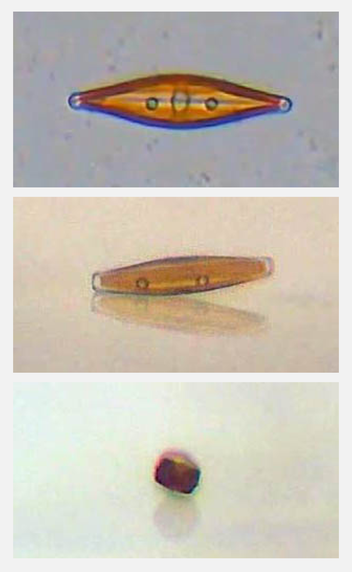 The third image shows the diatom viewed perpendicularly to the transapical plane. It moves towards the observer. Here, in the video from which the picture was taken, different lateral inclination angles in sequence can be observed. If the diatom rotates 90 ° around the apical axis, it is lying on the girdle band. Such tilting may occur at the points of movement reversal during movement and as a result of collisions between diatoms. This is to be excluded within the analyzed section of a trajectory.