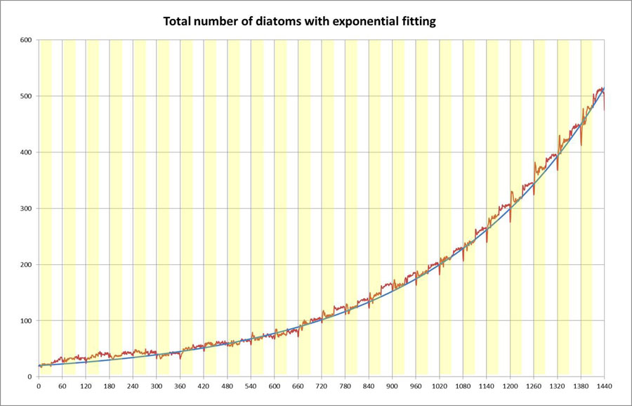 With the start of the light phase the number of individual diatoms increases rapidly. It falls off again in the course of the light phase. The area of the colonies decreases in mirror image. The conversion factor was selected in such a way that the sum of the two curves shows the smallest possible fluctuations with the light-dark cycle. This is not a precise quantitative count of the number of diatoms in the colonies. The following figure below shows the total number of diatoms resulting from the sum of the two curves discussed. An exponential function (red line) can be easily adjusted: