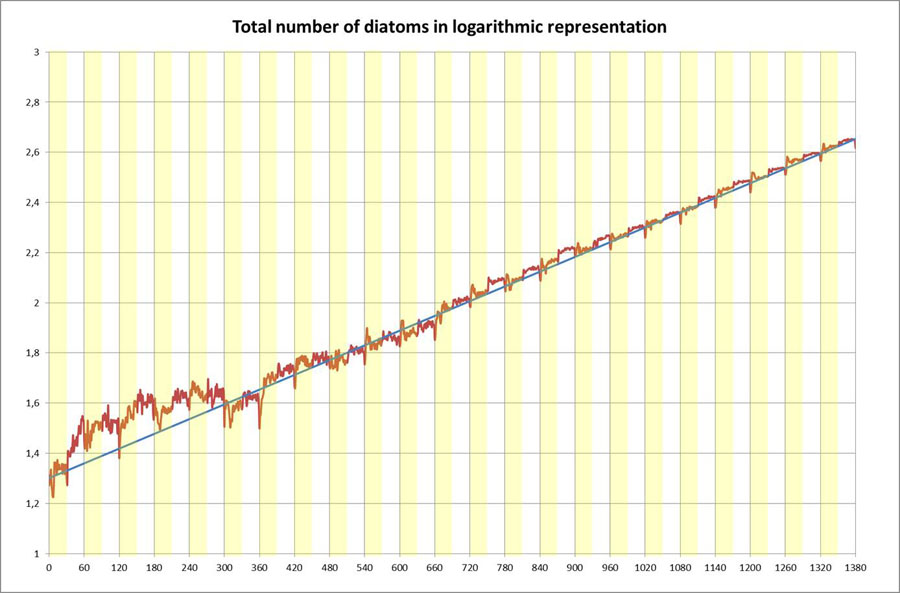 The corresponding logarithmic representation shows strong fluctuations at the beginning of cultivation, as there are only a few diatoms in the observed range (see note above):