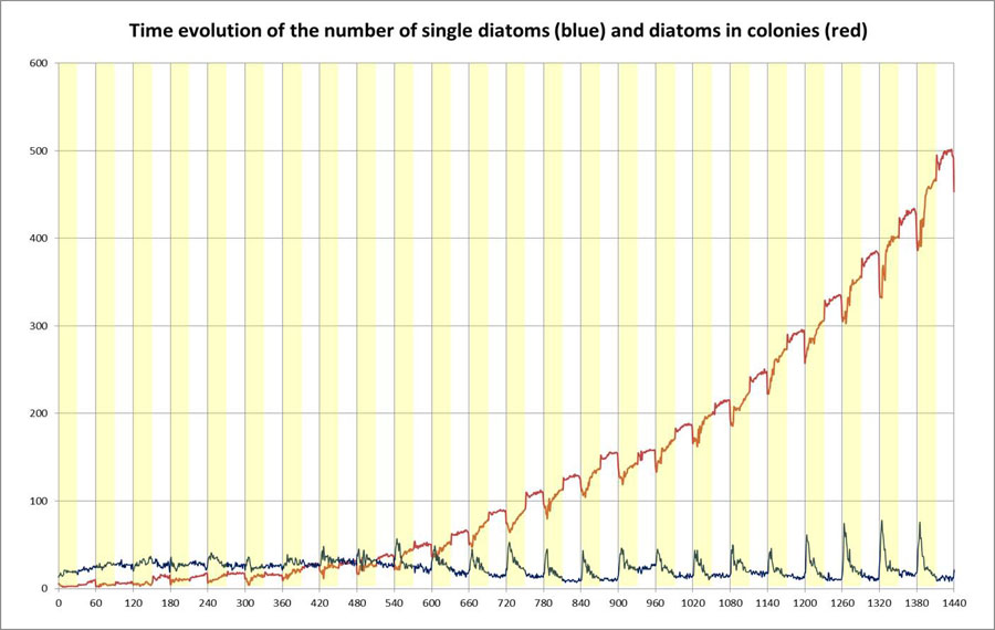 The following figure shows the number of individual diatoms (blue) and the number of diatoms in colonies (red) over time. The phases of bright light are marked with a yellow bar.