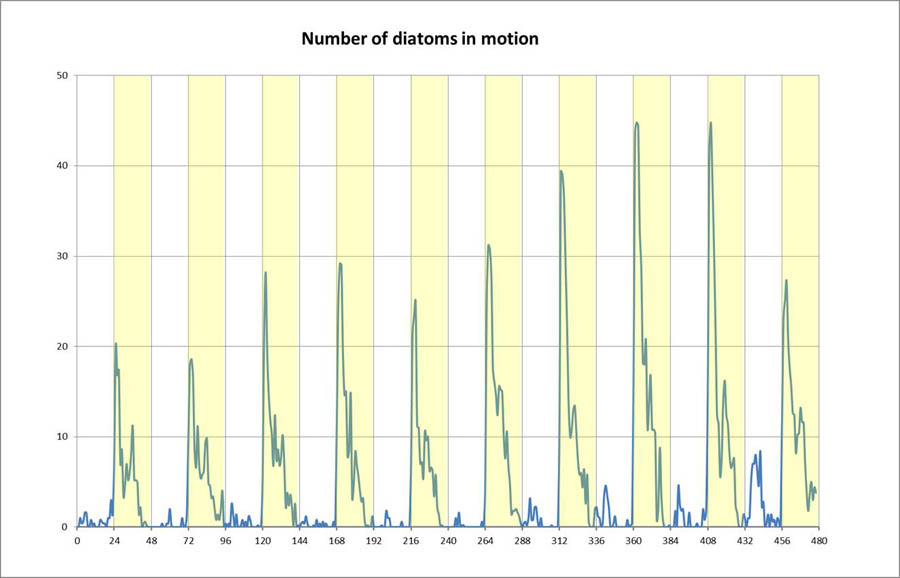 Apparently, the movement activity falls off quickly after the light phase has set in. However, this is just one example. Cymbella species can be observed that show high activity throughout the light phase. The already shown video on the activity in light and dark phase demonstrates this well.