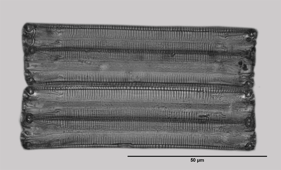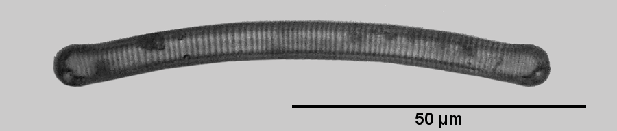 Württemberg (Mattern et al. 2019) the assignment to Eunotia glacialis seems probable. Since a residual doubt remains, it is referred to as Eunotia sp. here. The pictures on the left show the girdle and valve view. The diatoms have just developed from cell division and therefore their width (expansion in the direction of the pervalvarous axis) is small.