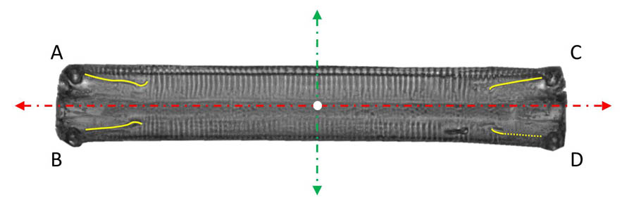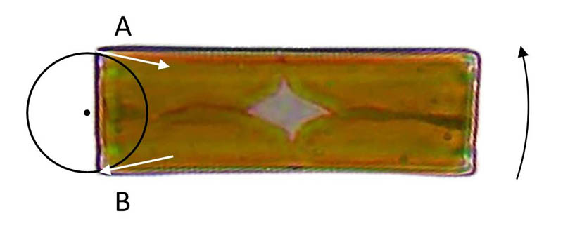 In addition to the high regularity, it is noticeable that the pivot point is slightly outside the diatom. An evident explanation of the rotational movement is that only the two raphe branches A and B (or C and D) are in contact with the substrate and their activity proceeds in opposite directions. One raphe works in apical direction, the other in distal direction. This is sketched in the following picture.