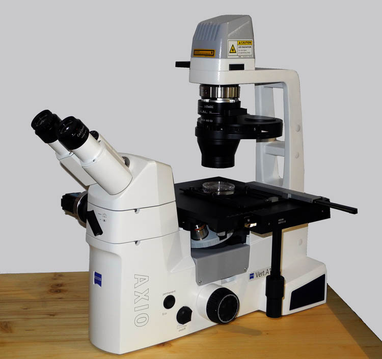 Since August 2017 I have been using a Zeiss Axiovert A1 with phase contrast and PlasDIC. The microscope can be seen on the left. Earlier recordings on this homepage were made with the Wilovert (Helmut Hund GmbH) shown elsewhere.