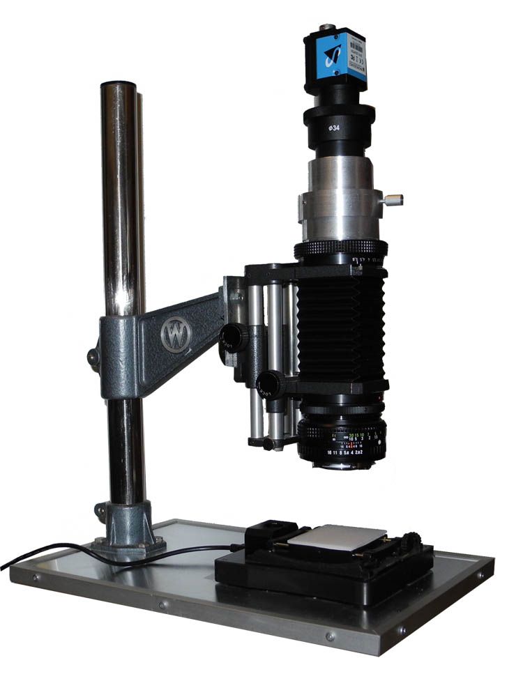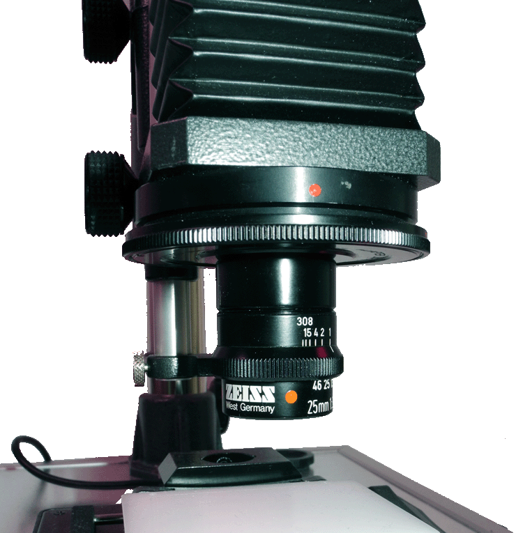 For long-term observations (long time lapse) at low magnification, I use a self-constructed macroscope, which consists of a a stand, bellows, camera lens in retro-position or macro lens and an eyepiece. You can see it on the left with the video camera attached and a simple lighting device. On the right you can see the device with a Zeiss-Luminar (25 mm focal length). This requires an adapter with RMS thread.