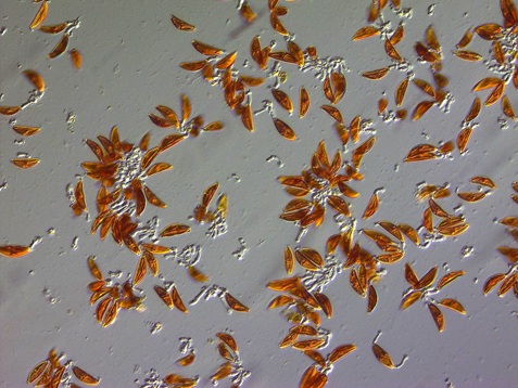 In both contrasting techniques, the almost transparent mucilage stalks are clearly visible. However, the impression is very different. Certain fine structures on the mucilage stalks are barely visible in phase contrast, whereas they can be recognized in PlasDIC.