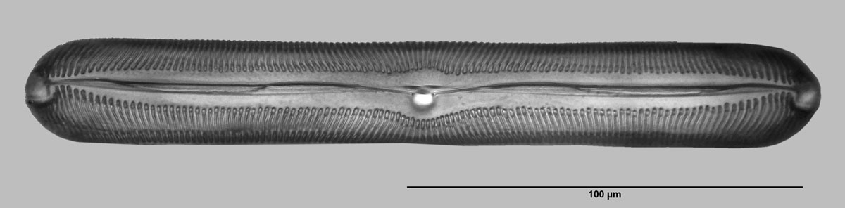 When Pinnularia cultures are prepared, a fast sedimentation of inserted diatoms is usually observed. An exception among my cultures was Pinnularia gentilis (Donkin) Cleve from a small pond in Hohenheim (Stuttgart, 48°42'32.2"N 9°12'40.3"E). At the time of observation, the diatoms were already in culture for 6 months and had a typical length of 200 µm. This is such a Pinnularia in valve view:
