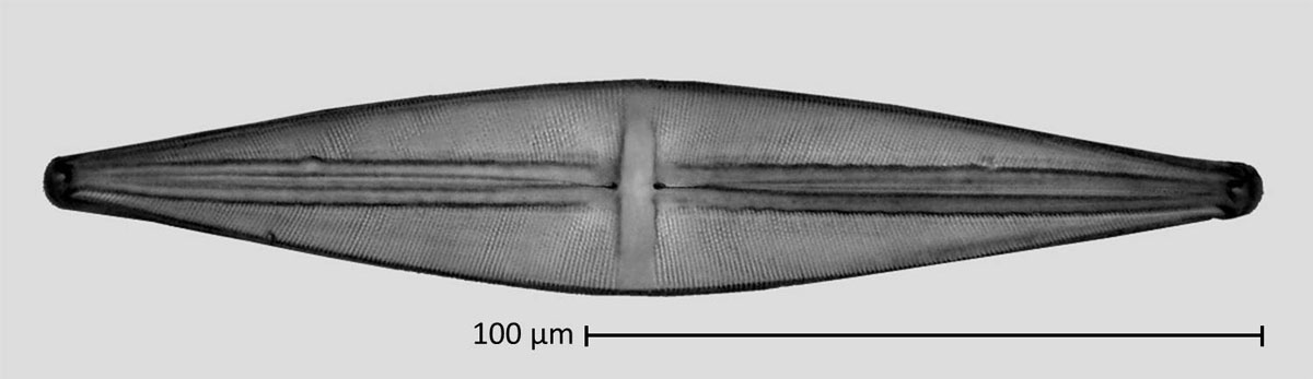 From a pond near Hohenheim (48°42'32.2"N 9°12'40.3"E) a diatom of the genus Stauroneis was isolated, which was about 180 µm long. It is likely to be Stauroneis phoenicenteron. This is the image of its valve (click to enlarge):