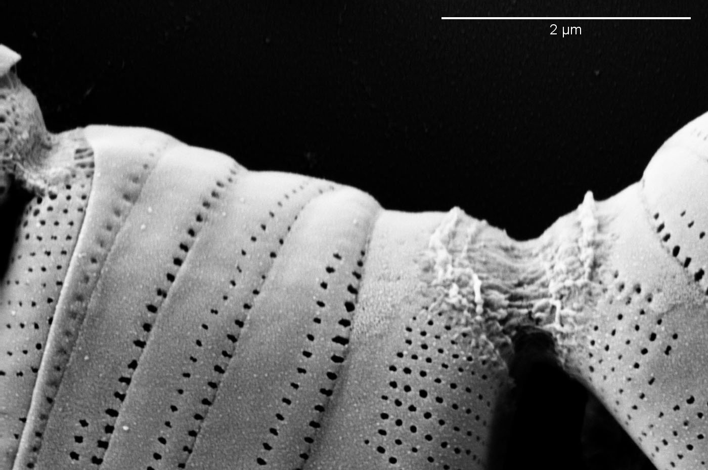 Dr. Nisch has also taken SEM images of Bacillaria paxillifera, which can be seen in an image gallery on the left. One can easily recognize the EPS, which serve the relative displacement. The preparation corresponds to that of the Diatoma species. Since thereby the samples were dried in the air after dehydration, artifacts are to be expected.