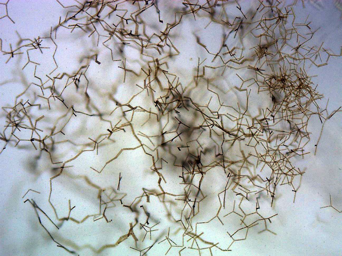 To the right you find pictures of Melosira. First you see a small beaker containing nutrient solution, into which a few fragments of a young Melosira colony have been given. Already after a few days in suitable lighting, a fine web of long colonies appeared. This web was taken with the stereo microscope at two magnifications. In order to achieve sufficient contrast, the photos were taken with dark field illumination. The original colony has already been broken into several fragments.